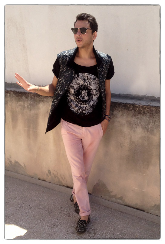 silk vest with printed studs: Angelos Frentzos / T-shirt: Pierre Balmain /