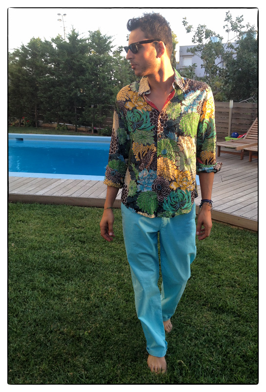 vintage shirt: Kenzo Homme / sky blue trousers: Etro / sunglasses: Ray-Ban wayfarer