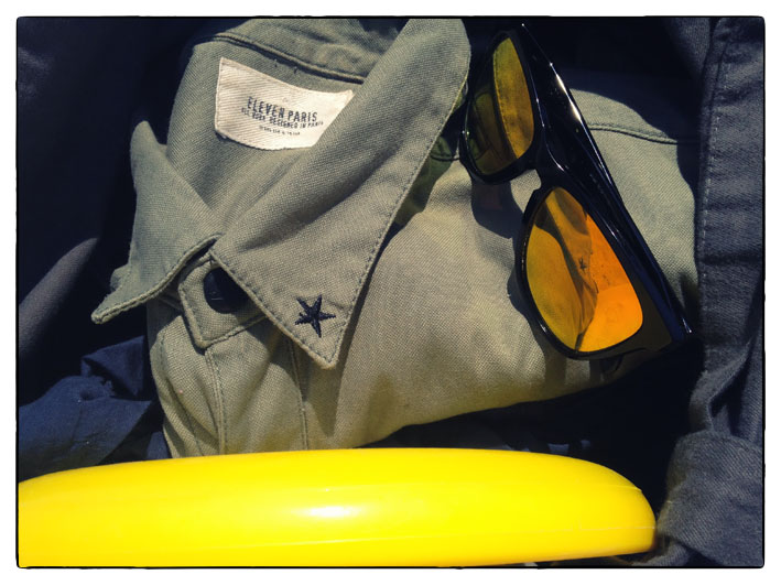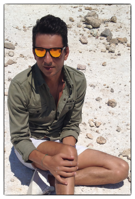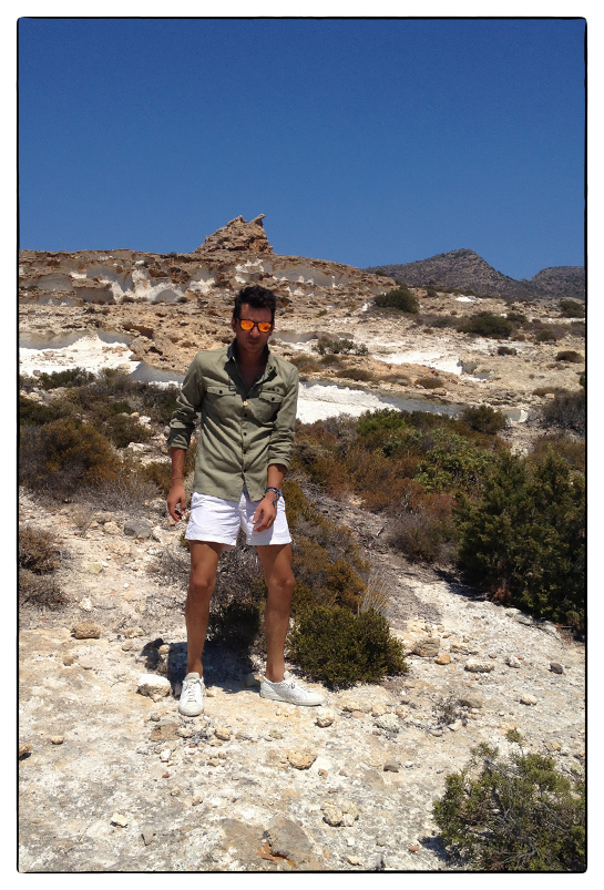 military shirt: Eleven Paris / white swim shorts: Orlebar Brown / sneakers: Common Projects
